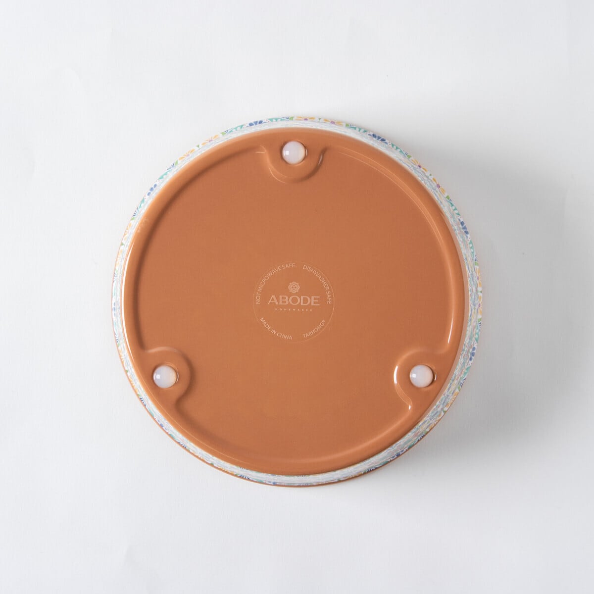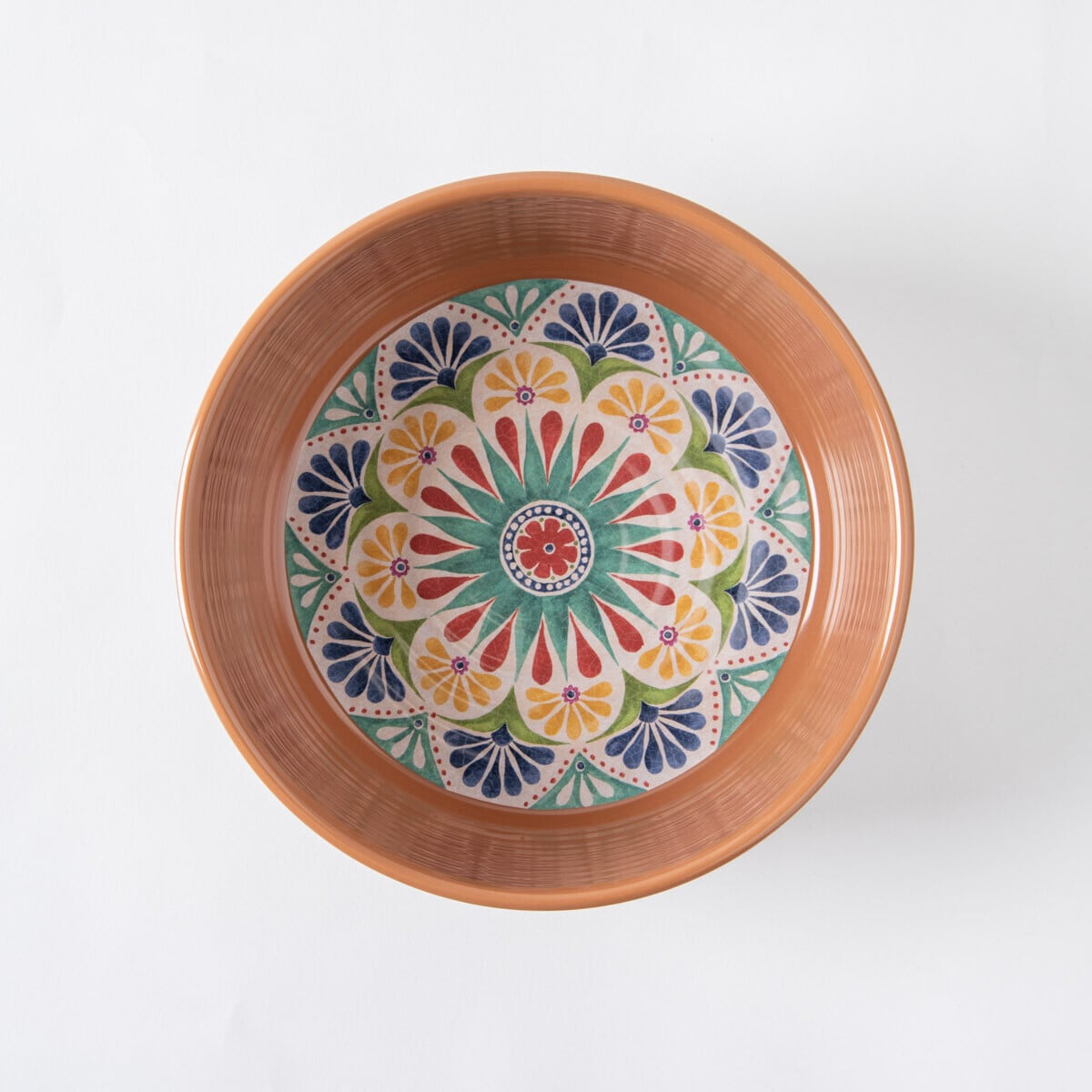 中央に向かって広がる華やかなモチーフが、異国情緒あふれる雰囲気を演出します。テラコッタ風のベースが、全体を引き締め、暖かみのある印象を与えています。