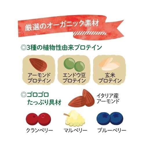 3種類の植物由来プロテインをバランスよく配合し、ナチュラルに美味しく仕上げています。植物由来のプロテインは、乳由来プロテインよりも穏やかに吸収されるため、お腹の持ちもよく、消化に負担がかかりにくいことが特徴です。
