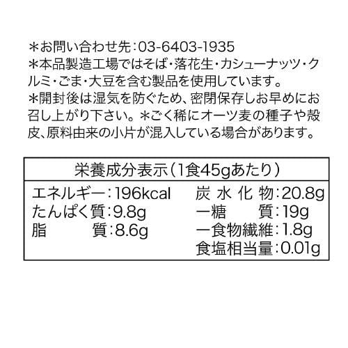 栄養価を損なわず、素材本来の味わいを生かす、焼き上げない「ノンベイク製法」で仕上げています。甘味料不使用で、穀物とドライフルーツの自然な甘みと風味が楽しめ、大粒のナッツと甘酸っぱいベリーがアクセントになる食べごたえです。