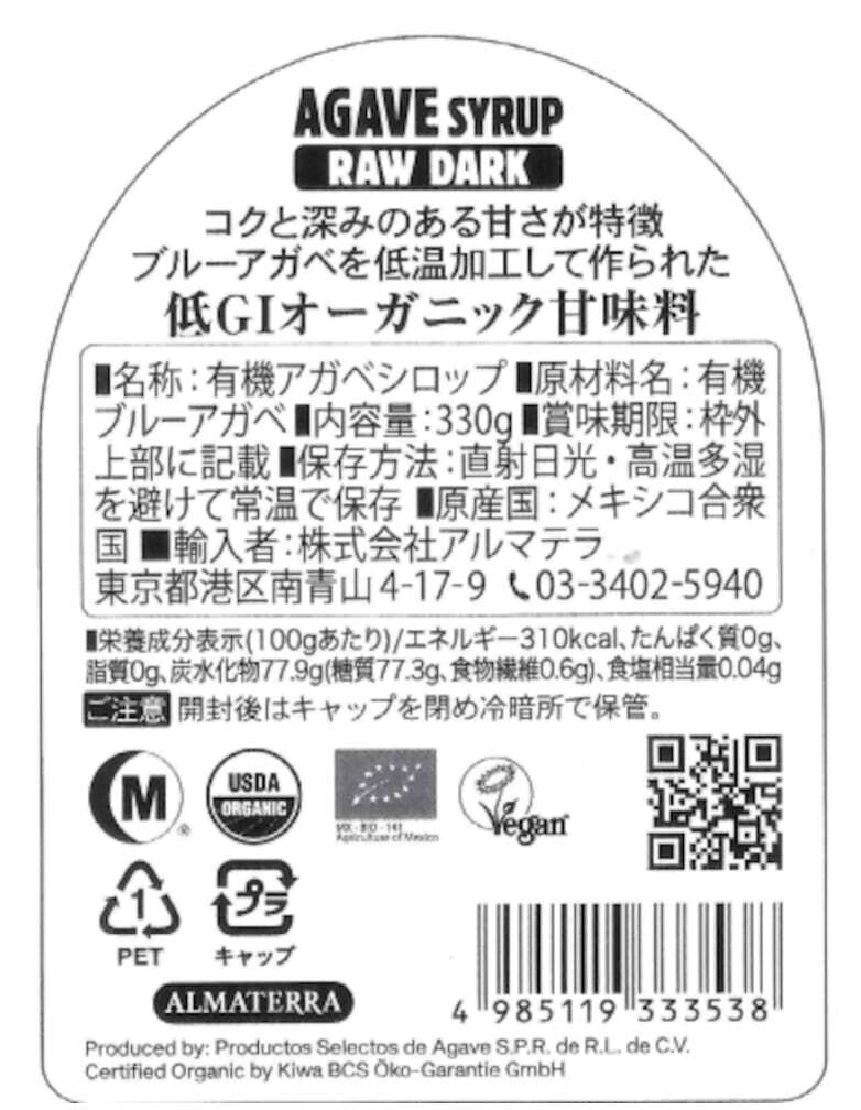 アルマテラのブルーアガベシロップは日本での有機JAS認証をはじめアメリカ、EU,などでも有機認証を取得しています。畑から原料の加工、ボトル充填まで全て有機認証を取得しており徹底した品質管理を行っております。