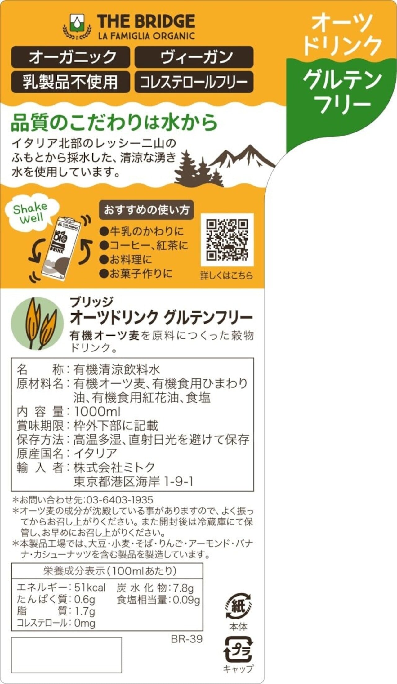 グルテンフリーの有機オーツ麦を使用した、すっきりとした甘みとオーツ麦のコクが特徴のドリンクです。