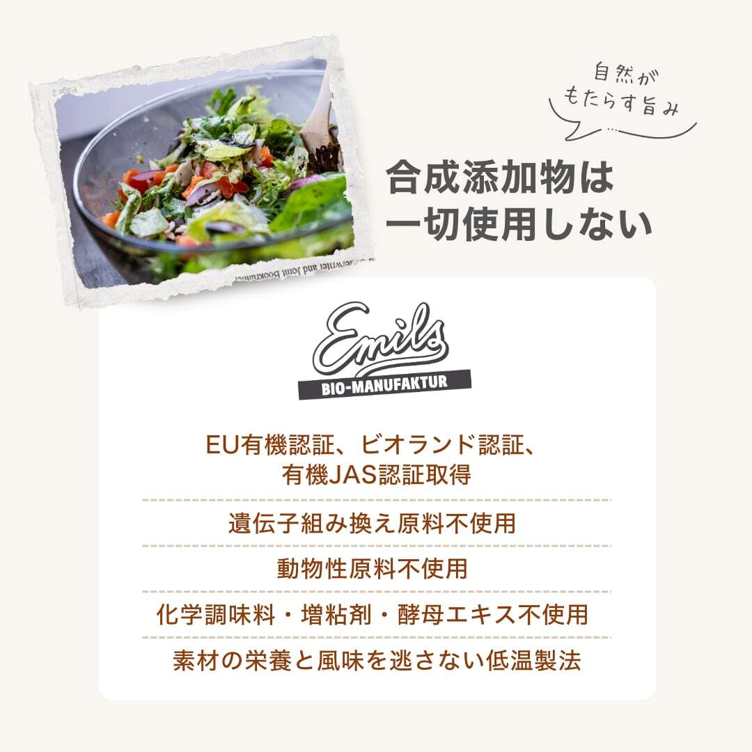 “ヴィーガン、増粘剤、添加物、酵母エキスも不使用!”
