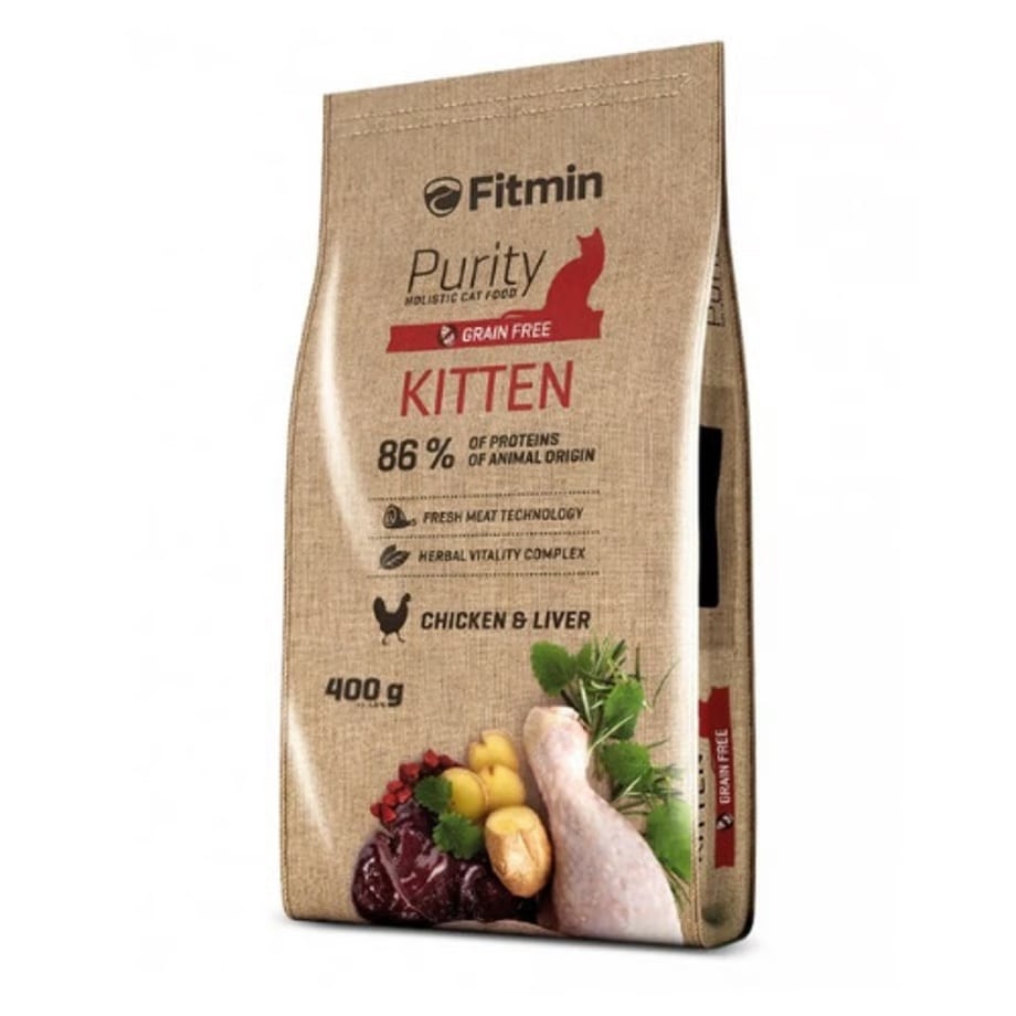 Fitmin cat Purity Kitten は、いわゆるグレインフリーのフードです。つまり、穀類を含まず、グルテンフリーで、アレルギー反応(小麦グルテンやトウモロコシグルテンなど)の発生リスクを低減します。