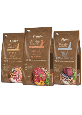 Fitmin Purityシリーズは9種類の飼料を提供しており、その中で豆、ジャガイモ、カボチャを原料とした米ベースの飼料(グルテンフリー)または穀物フリー飼料(グレインフリー+グルテンフリー)を選択できます。
