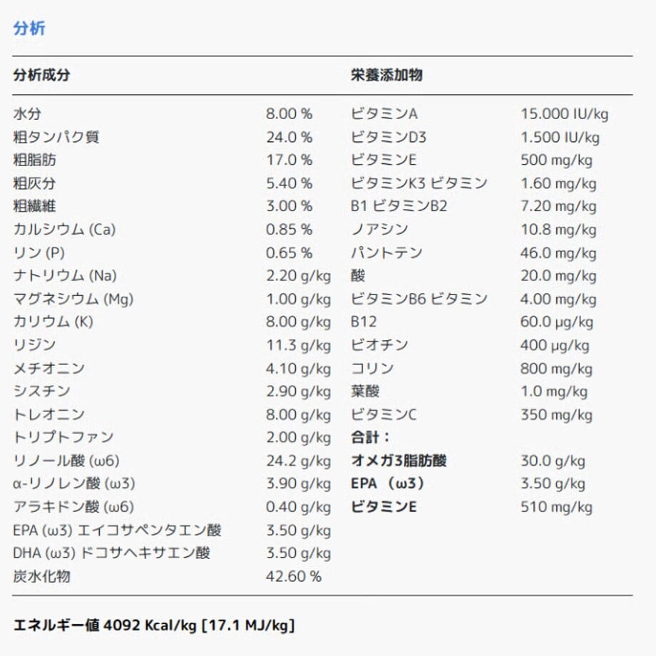米、トウモロコシ、脱水鶏肉タンパク質、鶏脂、乾燥ビートパルプ、ミネラル、サーモンオイル(2.5%)(EPAおよびDHAの天然源)、粉砕亜麻仁、トウモロコシグルテン、加水分解鶏肉タンパク質、エンドウ豆タンパク質、乾燥南極オキアミ(EPAおよびDHAの天然源)、乾燥リンゴ(ペクチン豊富)、 乾燥チコリ根(イヌリン及びフルクトオリゴ糖(プレバイオティクス(FOS))の天然源)、乾燥ビール酵母、加水分解酵母(β-グルカン及びマンナンオリゴ糖(プレバイオティクス(MOS))の天然源)、 トマト粉末、乾燥ボスウェリア(1,000mg/kg)、塩酸グルコサミン(1,000mg/kg)、コンドロイチン硫酸(300mg/kg)