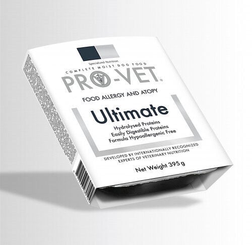 PRO-VETウルティメイトは、食物アレルギー、食物不耐症(過敏症)、アトピー(アトピー性皮膚炎)を持つすべての品種の成犬のための完全でバランスの取れたスチームウェットフードです。