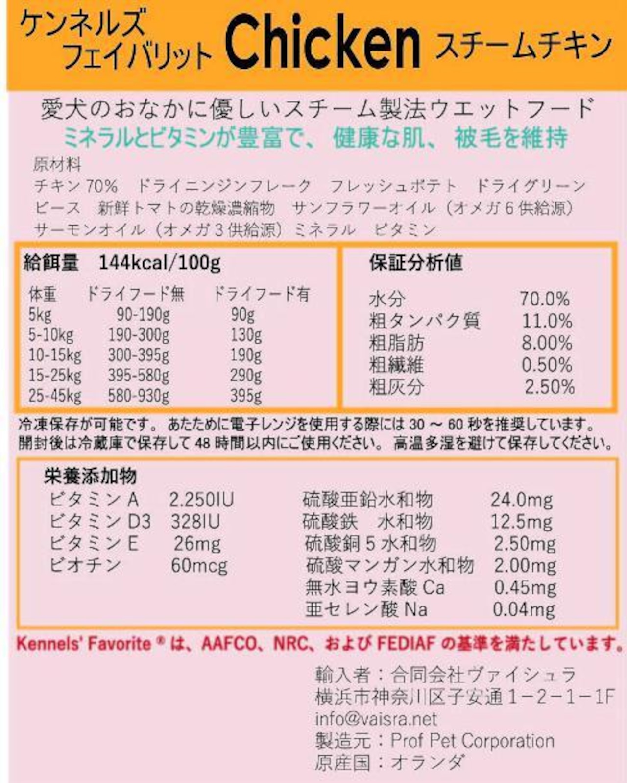 犬・100%天然成分・チキン/Kennels’favouriteスチームウェットフード 395g・着色料、香料、防腐剤、大豆などは一切なし