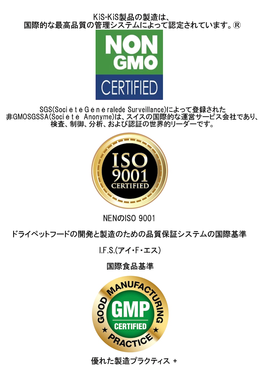 KiS-KiS.®製品は、AAFCO、NRC、および/または FEDIAF が規定する要件を満たしています。オランダで製造、梱包されています。