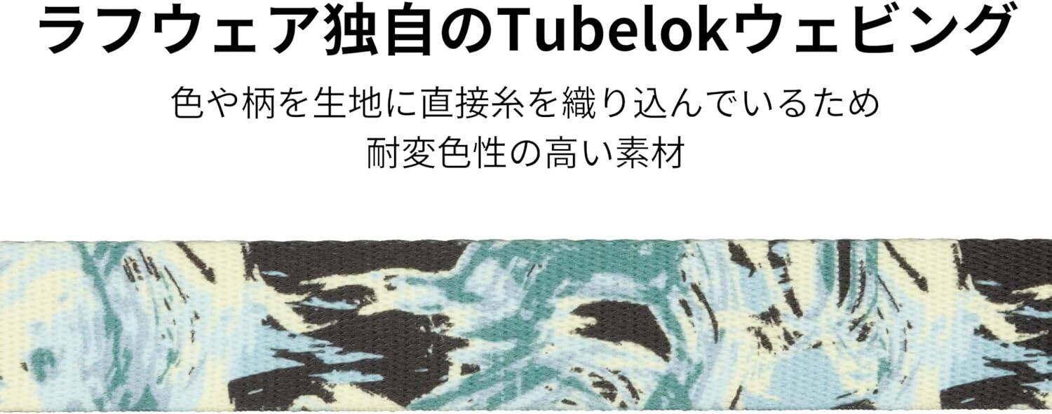 ラフウェア独自のTubelokウェビングは、色や柄を生地にプリントするのではなく、ジャカード織りで生地に直接糸を織り込んでいるため耐変色性の高い素材です。